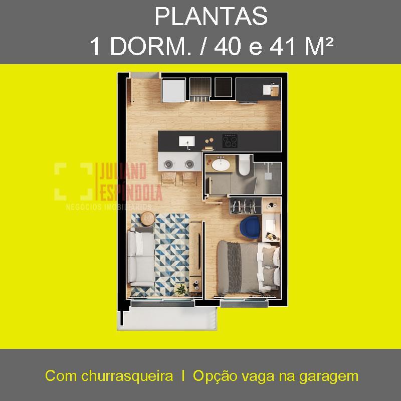 Plantas de 1 dormitório com 40 e 42 m², churrasqueira e opção de vaga na garagem.